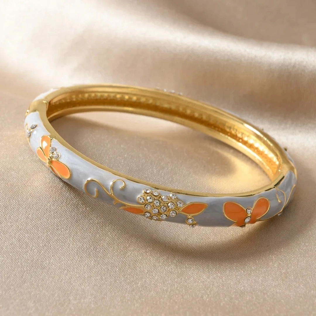 Featuring a copper base and thick 18K PVD gold plating, this lilac enamel bangle is dotted with delicate butterflies and a single cluster of crystals, blending everyday elegance with non-tarnish durability. Its smooth, rounded profile sits comfortably on the wrist—waterproof, sweat-friendly, hypoallergenic, and protected by a 1-year anti-tarnish warranty. Transition with ease from daily wear to dinner gatherings or thoughtful gifting.
