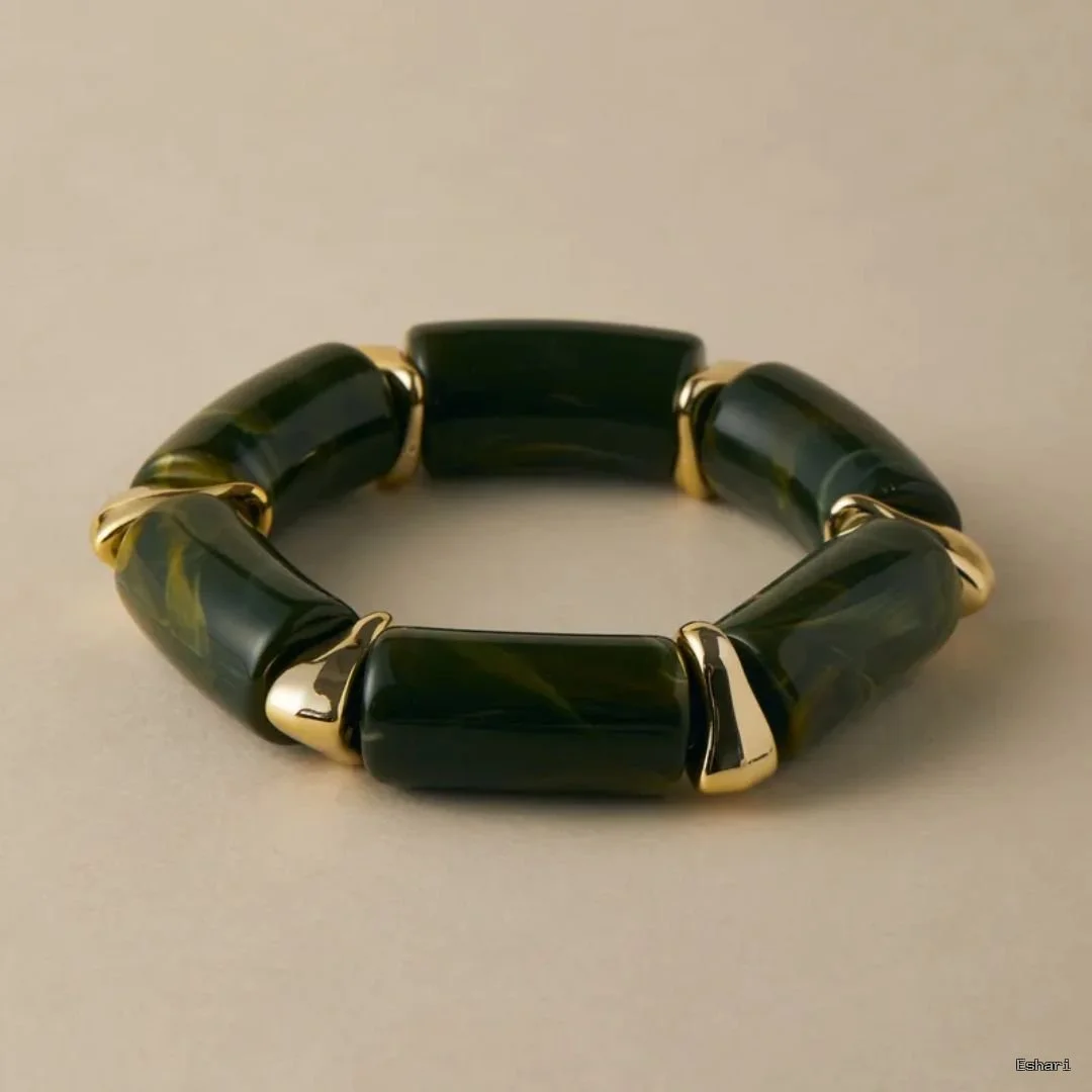 This statement bracelet uses premium resin in deep green with glossy gold-tone accents, offering a bold, tactile design that stands out in any stack. The construction is lightweight, comfortable, and resistant to water and daily wear. Ideal for modern looks, party dressing, or gifting, the bracelet’s resin segments provide a smooth, cool touch, while gold fittings keep your style polished. As with all Eshari pieces, durability and authenticity are backed by a one-year warranty covering color and finish integrity.