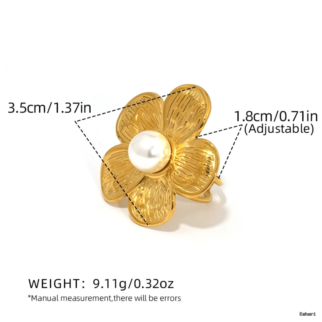 Crafted from 304 stainless steel with 18K PVD real gold plating, this adjustable flower ring features a pearl center and textured petal detailing. Built to resist moisture, tarnish, and skin irritation, this piece offers long-lasting shine with zero maintenance. Pair it solo for minimalist elegance or stack with delicate bands for a layered look. Backed by a 1-year anti-tarnish warranty. Perfect for daily wear and special occasions.
