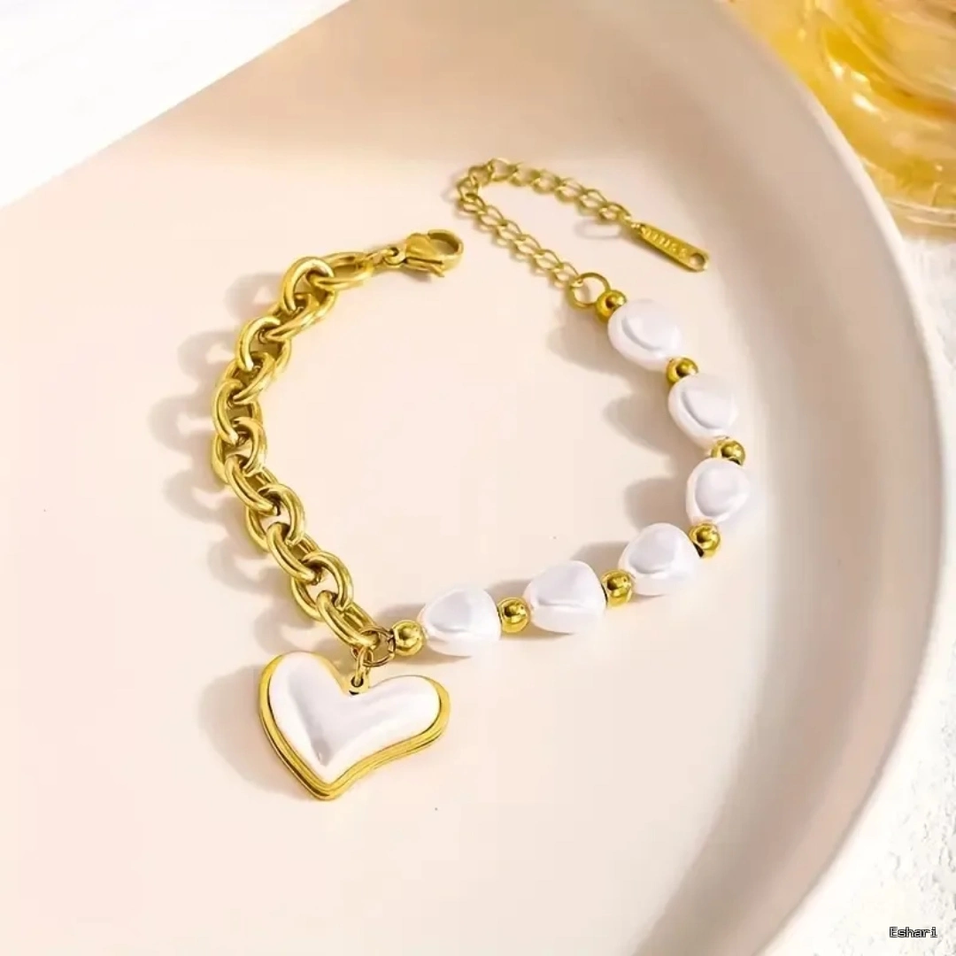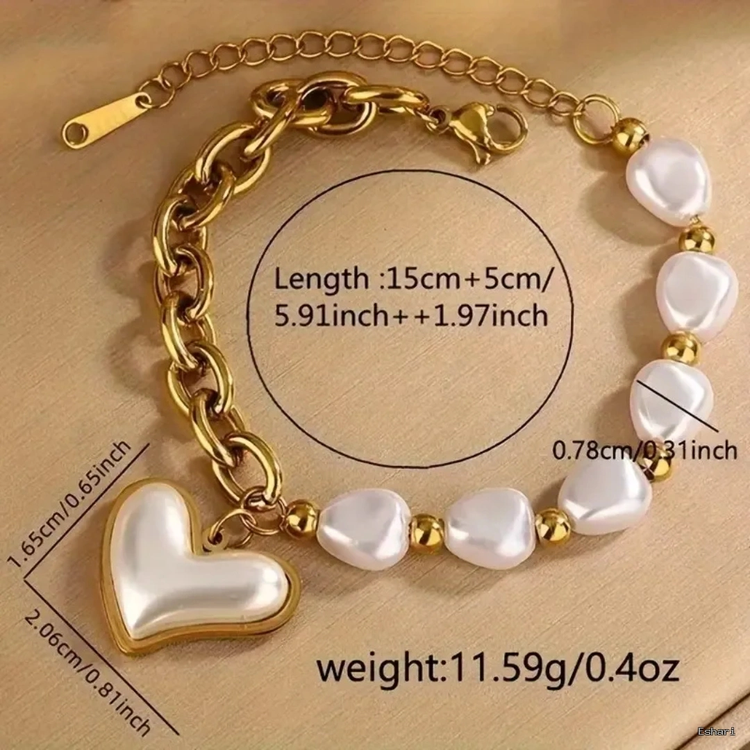 Embrace the gold pearl bracelet that blends sturdy chain links with smooth pearl accents and a delicate heart charm. Built on stainless steel with 18K PVD gold plating, it offers hypoallergenic comfort, waterproof protection, and anti-tarnish durability for seamless daily use without worry.