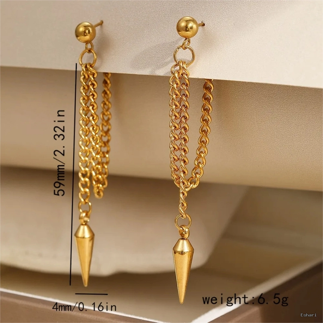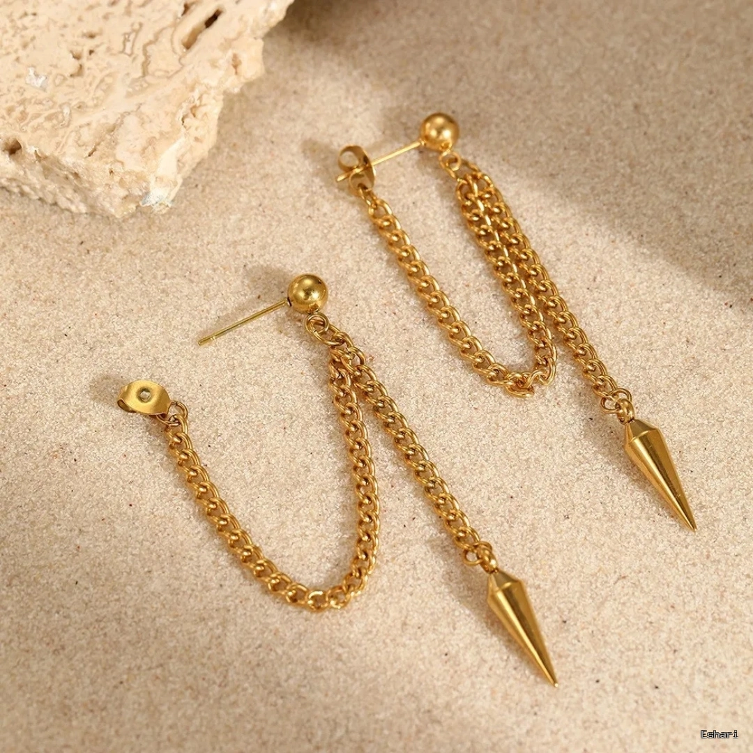 Crafted from stainless steel with genuine 18K PVD gold plating, these spike chain drop earrings feature a smooth ball stud with cascading gold chains ending in sleek, tapered spike pendants. Waterproof, sweat-proof, and hypoallergenic, they resist tarnish through daily wear, workouts, festivals, and evening events. The lightweight construction (6.5g) ensures comfortable all-day wear with edgy, contemporary flair. Backed by a 1-year anti-tarnish warranty for reliable everyday styling.
