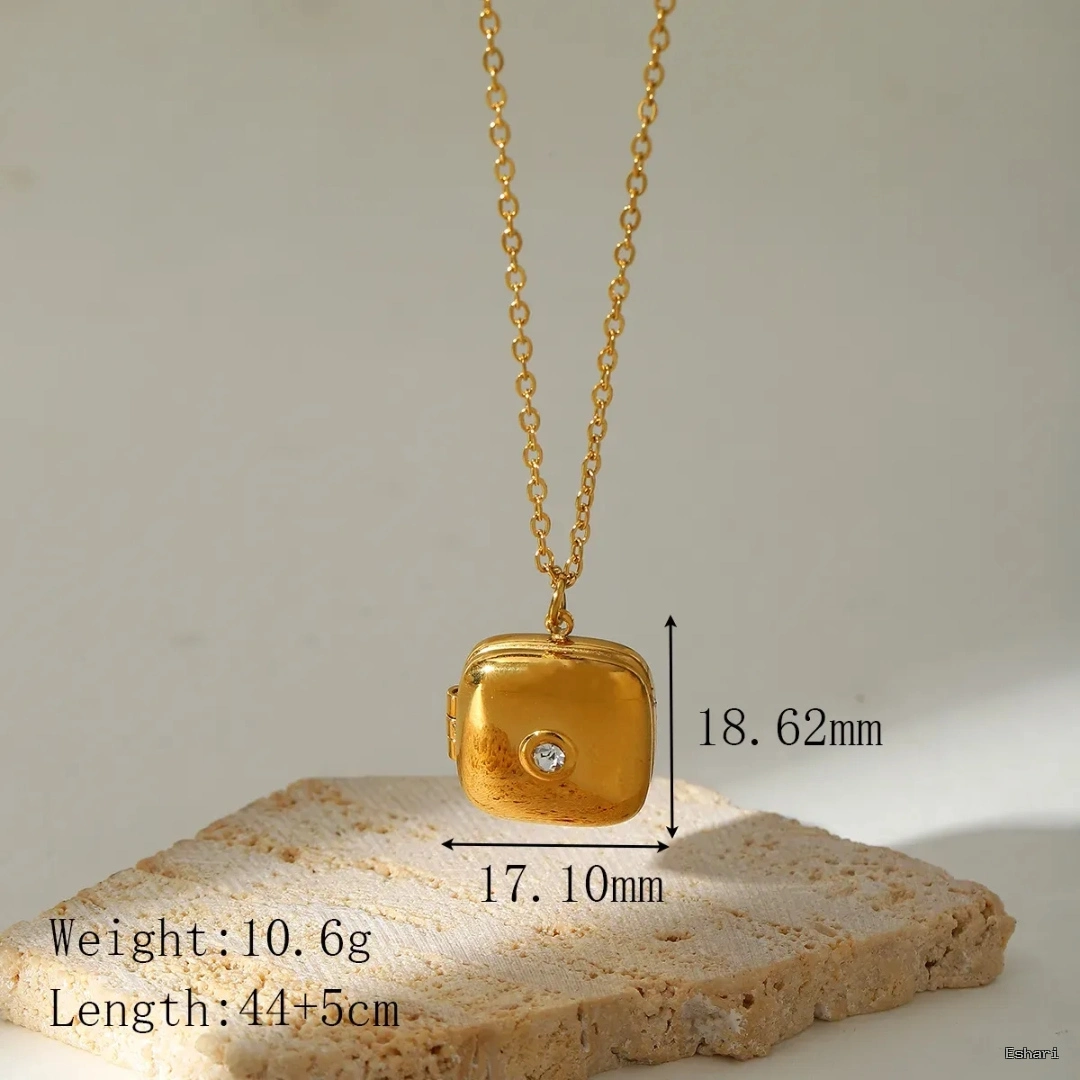 Built with stainless steel and 18K PVD gold plating, this gold square locket necklace resists tarnish and water exposure while keeping your personal treasures secure. The cushion-shaped locket opens to reveal a hidden compartment for photos or small keepsakes, with a centered crystal adding subtle dimension. Hypoallergenic and sweat-proof, it suits daily routines from office meetings to weekend brunches and festive gatherings.