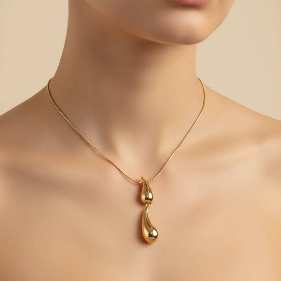 The Golden Duo Drop Pendant Necklace is a statement in contemporary form. Designed with a slender gold-plated chain, it showcases two smooth, sculptural teardrop pendants—a striking fusion of movement and shine. Each droplet reflects light beautifully, giving this piece a fluid, versatile appeal for both everyday sophistication and standout styling. Crafted for comfort with just the right weight, it’s a modern essential in any jewelry wardrobe.