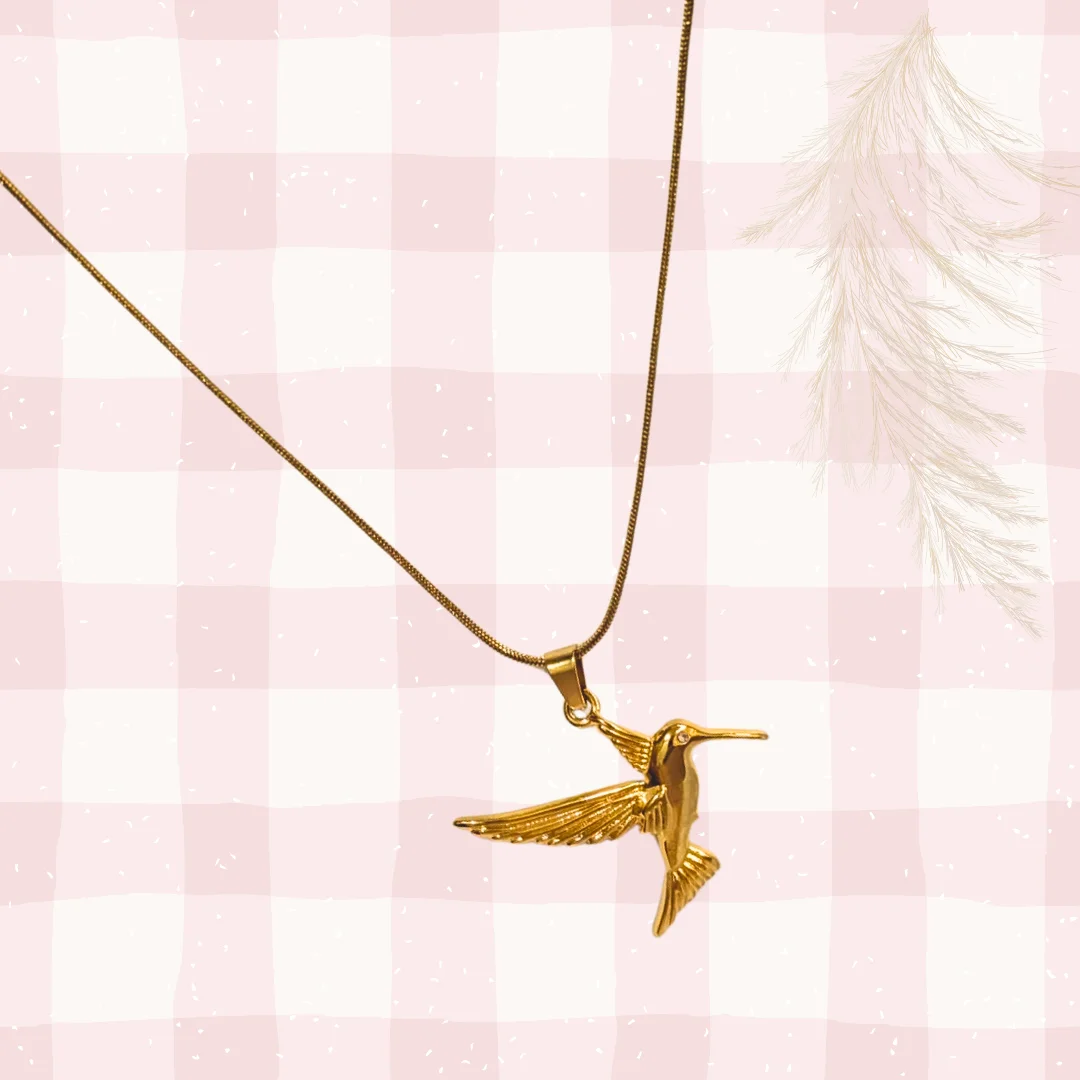 Channel effortless grace with the Golden Hummingbird Pendant Necklace. Crafted with an 18k gold-plated finish, the slender chain showcases a beautifully detailed hummingbird pendant that captures the spirit of freedom and beauty in flight. Lightweight and versatile, this necklace brings a subtle radiance to everyday outfits and special looks alike, making it a timeless addition to any collection.