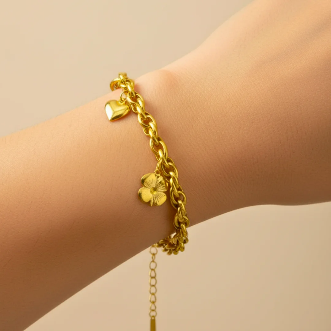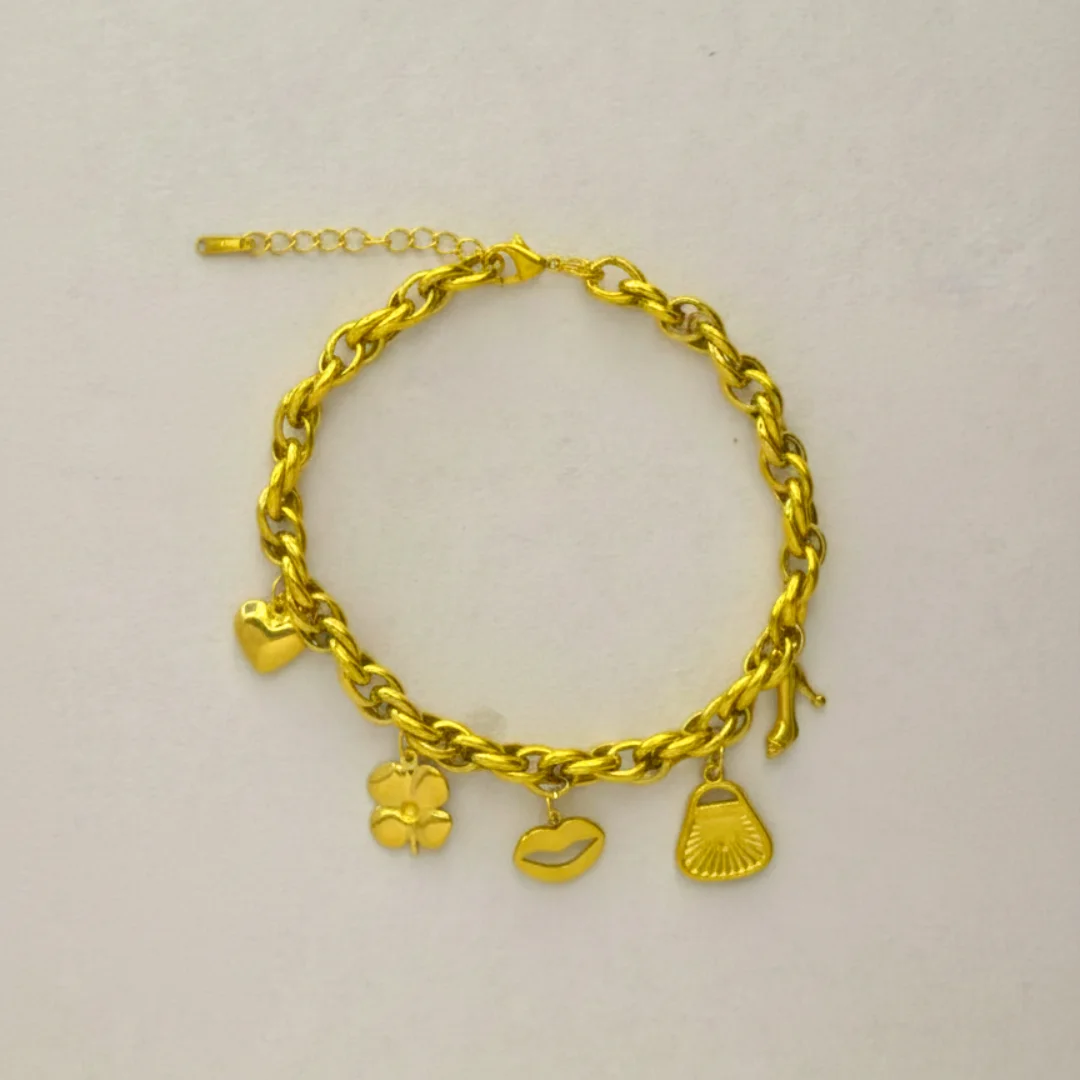 Showcase your individuality with the Golden Luxe Charm Chain Bracelet. Crafted with high quality base metal and luxe thick 18k gold plating, this eye-catching bracelet boasts a playful mix of charm icons—heart, clover, lips, shell, and more—suspended from a gleaming chain. Its adjustable fit ensures comfort and versatility, making it the perfect finishing touch for both casual days and party nights.