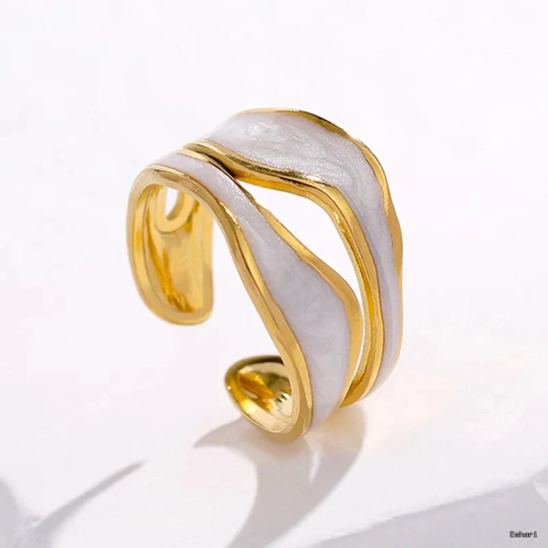 Adjustable cuff ring with white enamel and 18K PVD gold plating on stainless steel base for waterproof, tarnish-free wear